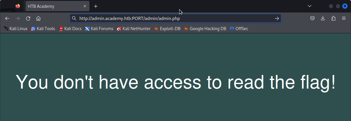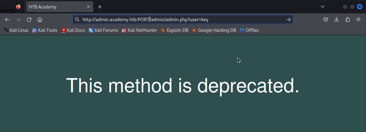 kali@kali$ curl http://admin.academy.htb:PORT/admin/admin.php -X POST -d 'user=key' -H 'Content-Type: application/x-www-form-urlencoded'